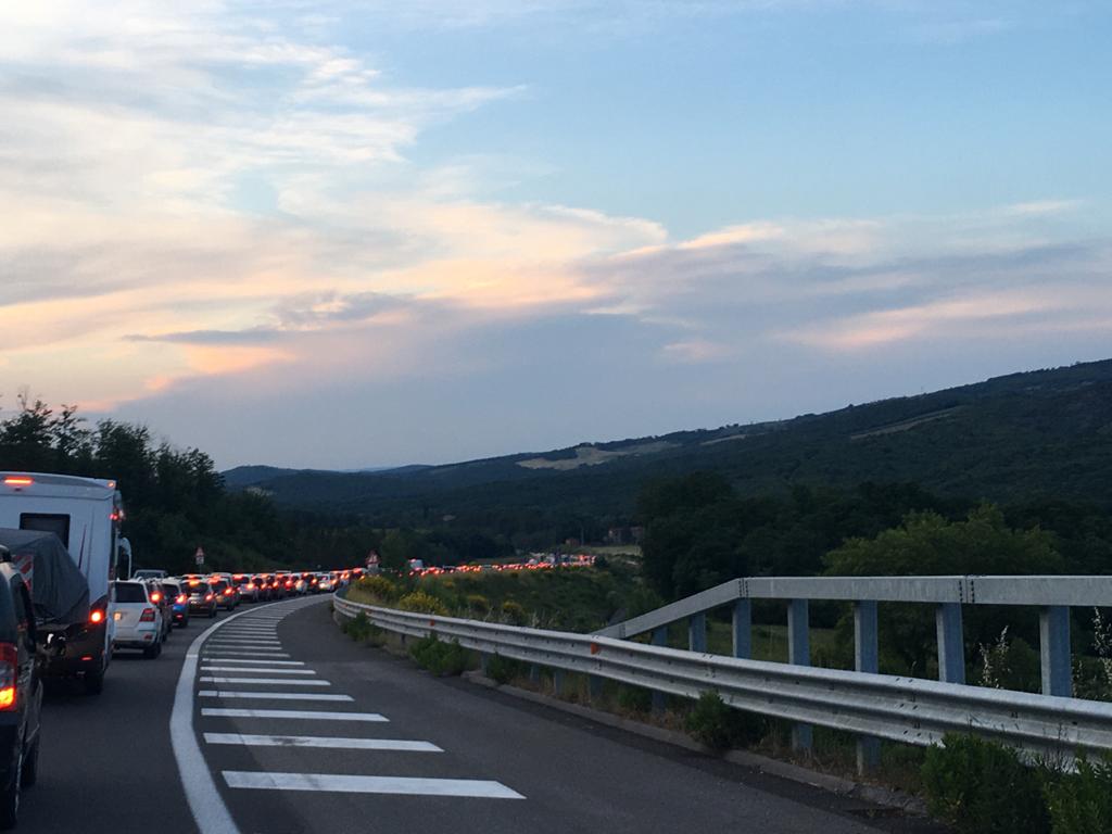 Traffico intenso questa sera lungo la Siena-Grosseto dove sono molte le auto di coloro che ritornano dopo una giornata di mare.