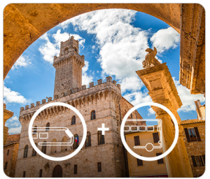 Selezionando come destinazione finale o di partenza «Montepulciano Centro», in un solo click si acquisterà il biglietto “intermodale” del treno per la stazione di Montepulciano (sulla linea Siena-Chiusi) o Chiusi – Chianciano Terme (sulla linea convenzionale Firenze-Roma) e quello dell’autobus, in coincidenza che da queste due stazioni arriverà fino al centro di Montepulciano.
