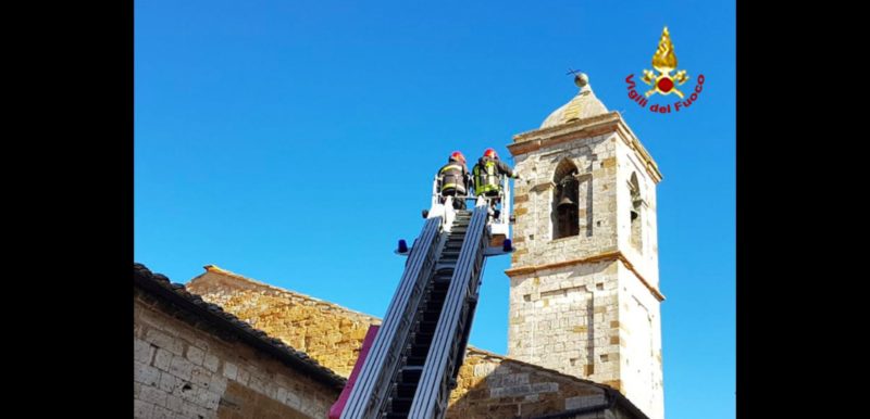 I Vigili del Fuoco del Comando di Siena e del distaccamento di Montepulciano sono intervenuti a Trequanda, Piazza Garibaldi, presso la chiesa dei Santi Pietro e Paolo, per la rimozione della sfera in rame con crocifisso, posta sulla cuspide del campanile.
