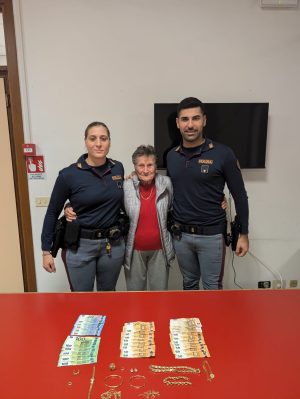 Nella borsa della truffatrice è stato trovato anche il foglio scritto dalla vittima durante il colloquio con i complici. La signora tornata in possesso dei suoi averi e sorpresa da tanta velocità nella soluzione della vicenda, non ha trovato le parole per ringraziare poliziotti che ha voluto stringere in un abbraccio.