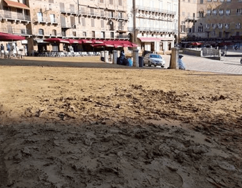 E’ polemica in questi giorni a Siena per le condizioni di Piazza del Campo, dove il tufo, a 4 giorni dal Palio, non è stato ancora rimosso.