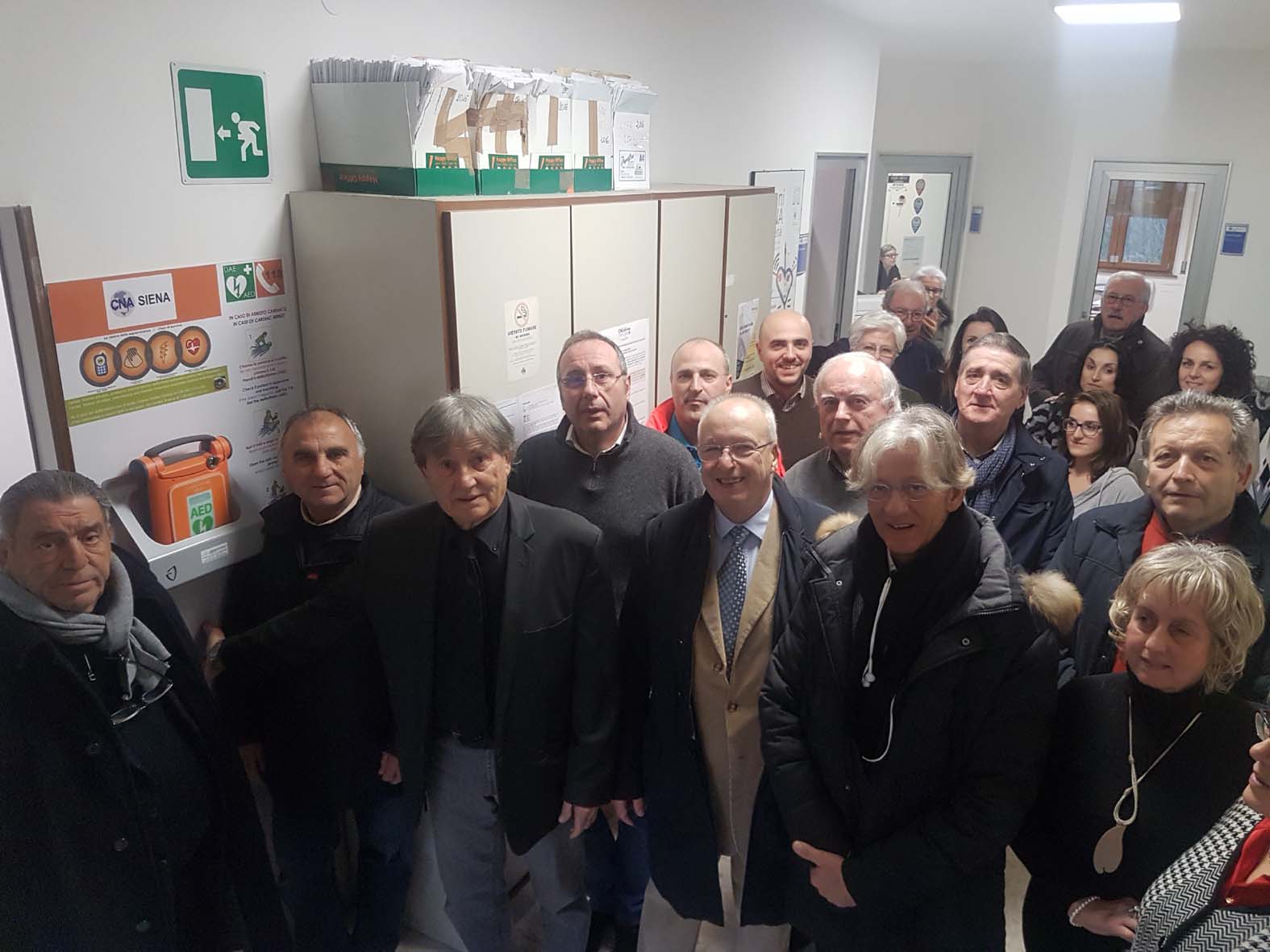 Hanno partecipato all’acquisto del defibrillatore dipendenti Cna e pensionati, grazie anche l’impegno della Misericordia di Siena con i formatori guidati da Leonardo Bonelli e dalla dottoressa Chiara Gannitti. Al taglio del nastro sono stati presenti il provveditore della Misericordia Andrea Valboni ed Eugenio Conte, presidente di Acti Toscana (Associazione cardio trapiantati italiani) oltre a Stefano Riccucci di SienaMedical.