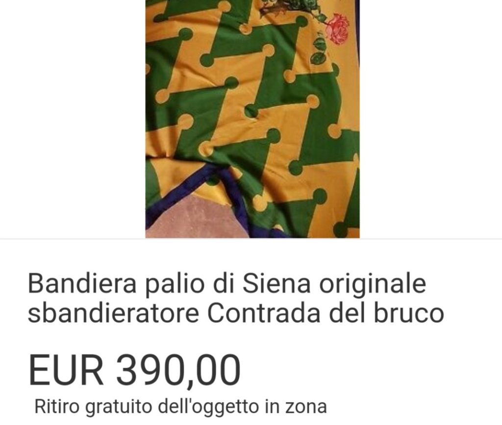 “Bandiera palio di Siena originale sbandieratore Contrada del Bruco – si legge nell’annuncio, che dà come luogo di spedizione Calenzano – La condizione Usato. Altezza circa 200 cm ottimo stato di conservazione. Manico bilanciato in legno, con tacche per bilanciamento rivestito in pelle . Molto raro. Si consiglia ritiro a mano ma posso anche spedire”.
