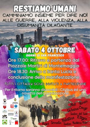 Il Coordinamento Rete Sociale di San Gimignano, al quale partecipano le Associazioni Arciconfraternita di Misericordia, Gruppo Donatori di Sangue Fratres, Auser, Centro di Ascolto Caritas-San Vincenzo de’Paoli e San Gimignano Solidale, ha promosso per SABATO 4 OTTOBRE dalle ore 17 alle ore 19, un percorso di pace con ritrovo e partenza presso il Monumento ai Caduti al Piazzale Martiri di Montemaggio di San Gimignano ed arrivo, lungo la via Francigena, al Parco pubblico di Santa Lucia.