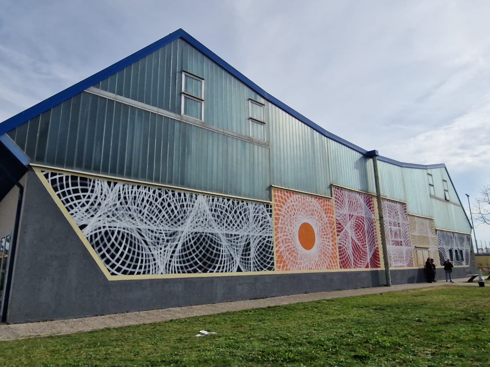 L’intero progetto è curato da Carolin Angerbauer (Culturing APS) e Gian Guido Grassi (Start Attitude). La prima opera presentata è quella realizzata dall’artista Moneyless nel Comune di Sinalunga. Si tratta di una pittura murale dipinta sulla facciata del palazzetto dello sport di Sinalunga, trasformando uno spazio pubblico quotidiano in un vero e proprio punto di riferimento artistico per la comunità. L’intervento sviluppa un linguaggio geometrico di ispirazione optical, dove ritmo e colore si intrecciano come fili di un tessuto visivo. Le trame, ottenute attraverso moduli ripetitivi e variazioni cromatiche, evocano la complessità della società contemporanea: una rete di relazioni, connessioni e contrasti che convivono in equilibrio dinamico. L’opera invita lo sguardo a muoversi, a cercare un ordine nel movimento e una forma nel caos, trasformando l’architettura in una superficie pulsante di energia e significato. Moneyless, con la sua opera, va a instaurare un dialogo profondo tra arte contemporanea e architettura urbana. L’intervento, oltre a valorizzare l’edificio, contribuisce così a ridefinire il paesaggio visivo del luogo, rendendolo più dinamico e stimolante, e invitando cittadini e visitatori a una nuova percezione dello spazio.
