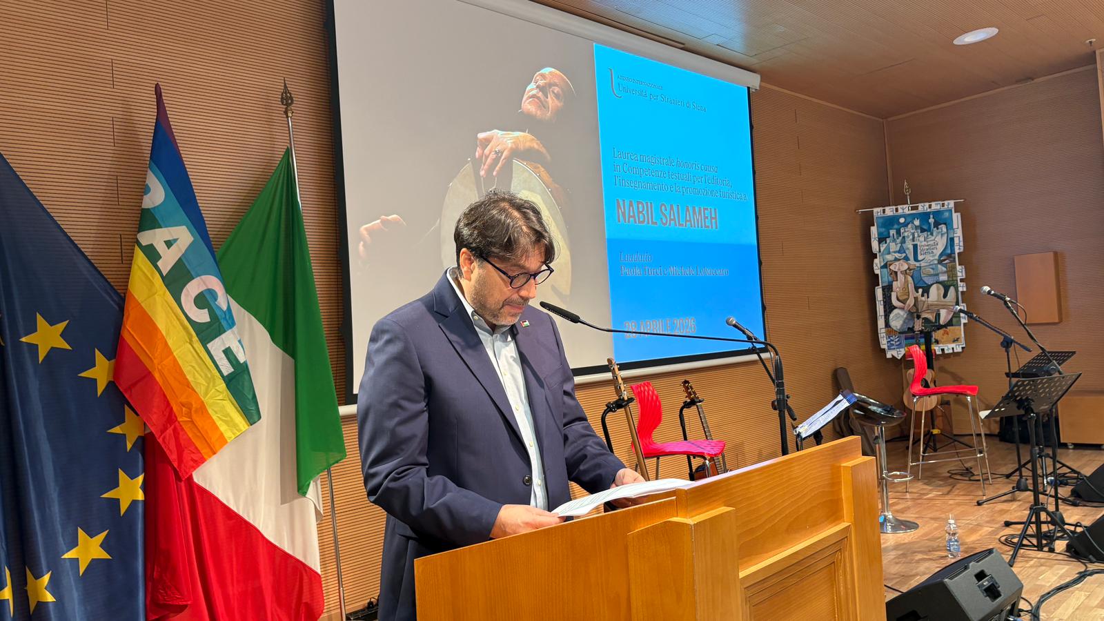 C’è un silenzio particolare, nelle grandi occasioni. Non è assenza di suono, ma attesa. È quello che si respirava nell’aula magna Virginia Woolf dell’Università per Stranieri di Siena quando la voce, le parole e la storia di Nabil Salameh hanno incontrato il riconoscimento più solenne che un ateneo possa conferire: la Laurea Magistrale honoris causa.