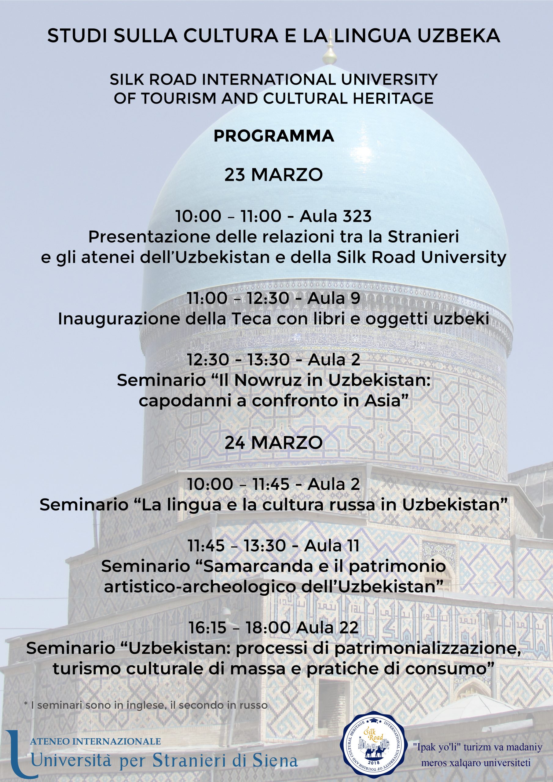 Le due giornate saranno dedicate alla promozione degli studi sulla cultura uzbeka, con numerosi eventi. Le giornate si apriranno con una introduzione della prof.ssa Carla Bagna, delegata del rettore alle Relazioni Internazionali, sulle relazioni attive fra i due atenei e sulle possibilità di mobilità fra Italia e Uzbekistan. Seguirà la presentazione dell’offerta formativa e degli spazi dell’Università di Samarcanda. In occasione della visita della delegazione della Silk Road University, si inaugurerà una teca dedicata a libri e oggetti artigianali e artistici della tradizione uzbeka, donati dall’università ospite.
