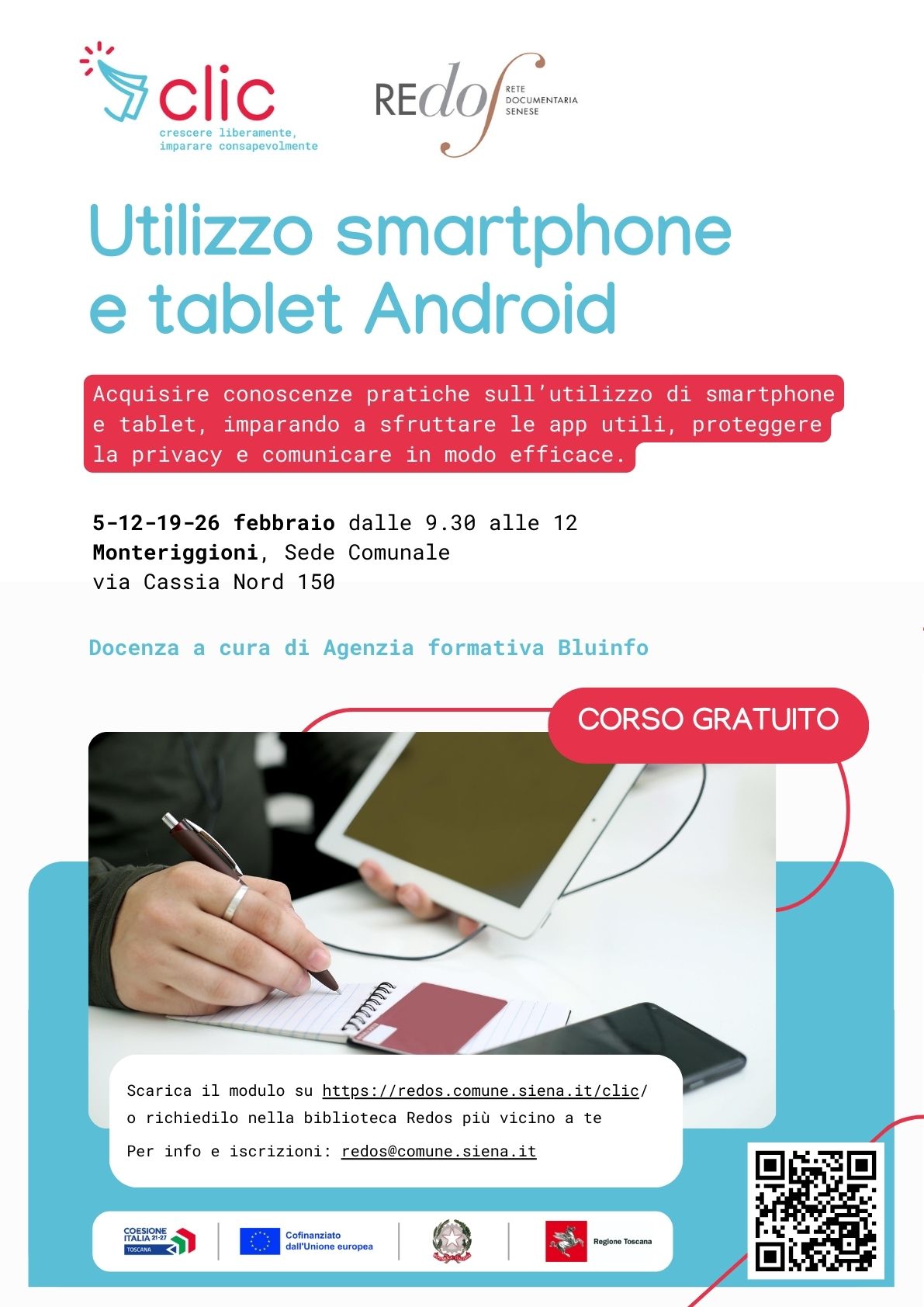 Nell’ambito del progetto CLIC della Rete Redos delle biblioteche senesi, presso la sede del comune di Monteriggioni in via Cassia Nord 150, si svolgerà un corso gratuito di “Utilizzo smartphone e tablet Android”.
