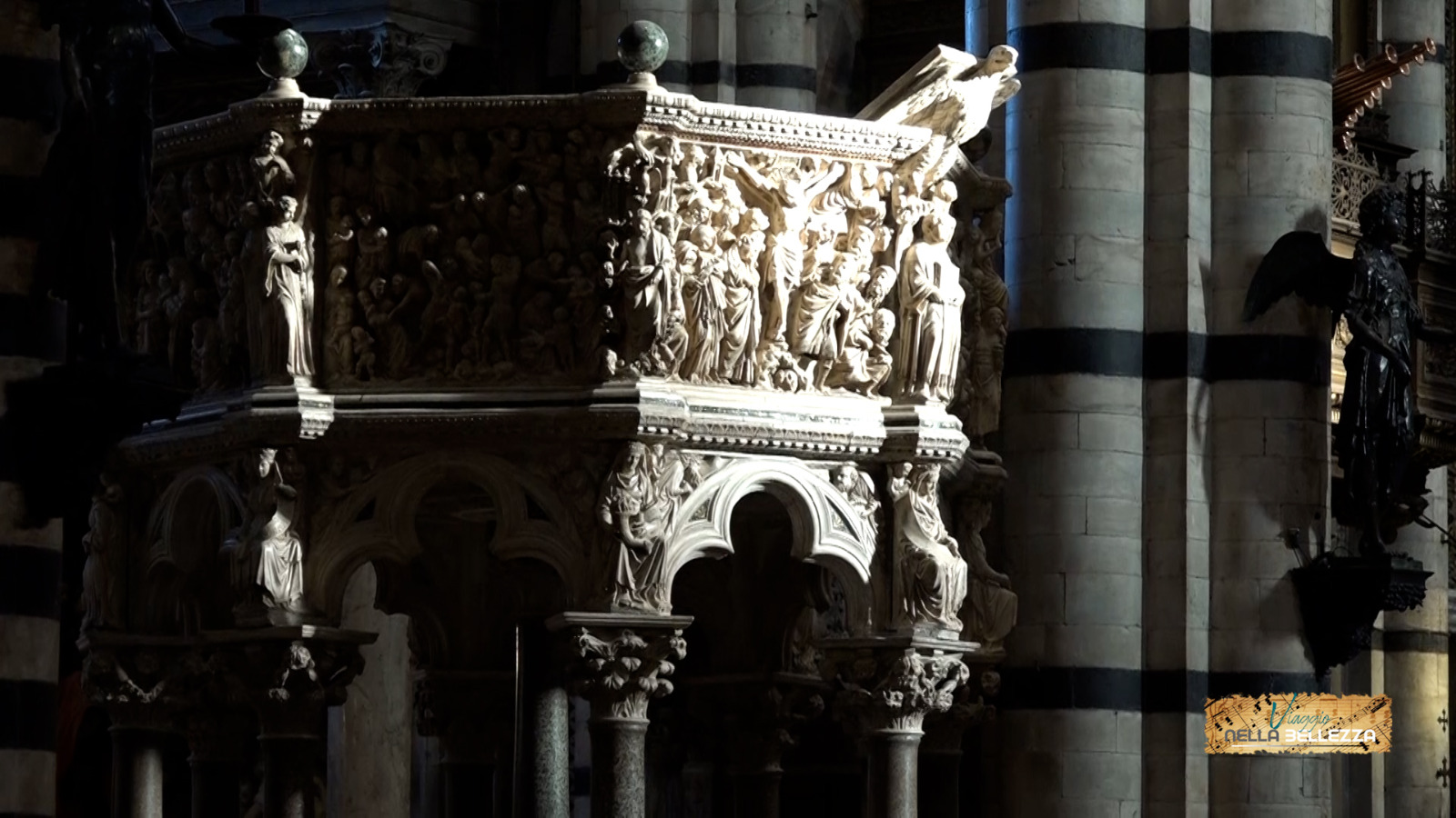 Il pulpito di Nicola Pisano nel Duomo di Siena e la musica dell’Orchestra del Conservatorio Rinaldo Franci con i cori ‘Agostino Agazzari’ e ‘Polifonici Senesi’, sono al centro del mix proposto nel “viaggio” di stasera. L’illustrazione del pulpito è a cura del professor Alessandro Bagnoli.