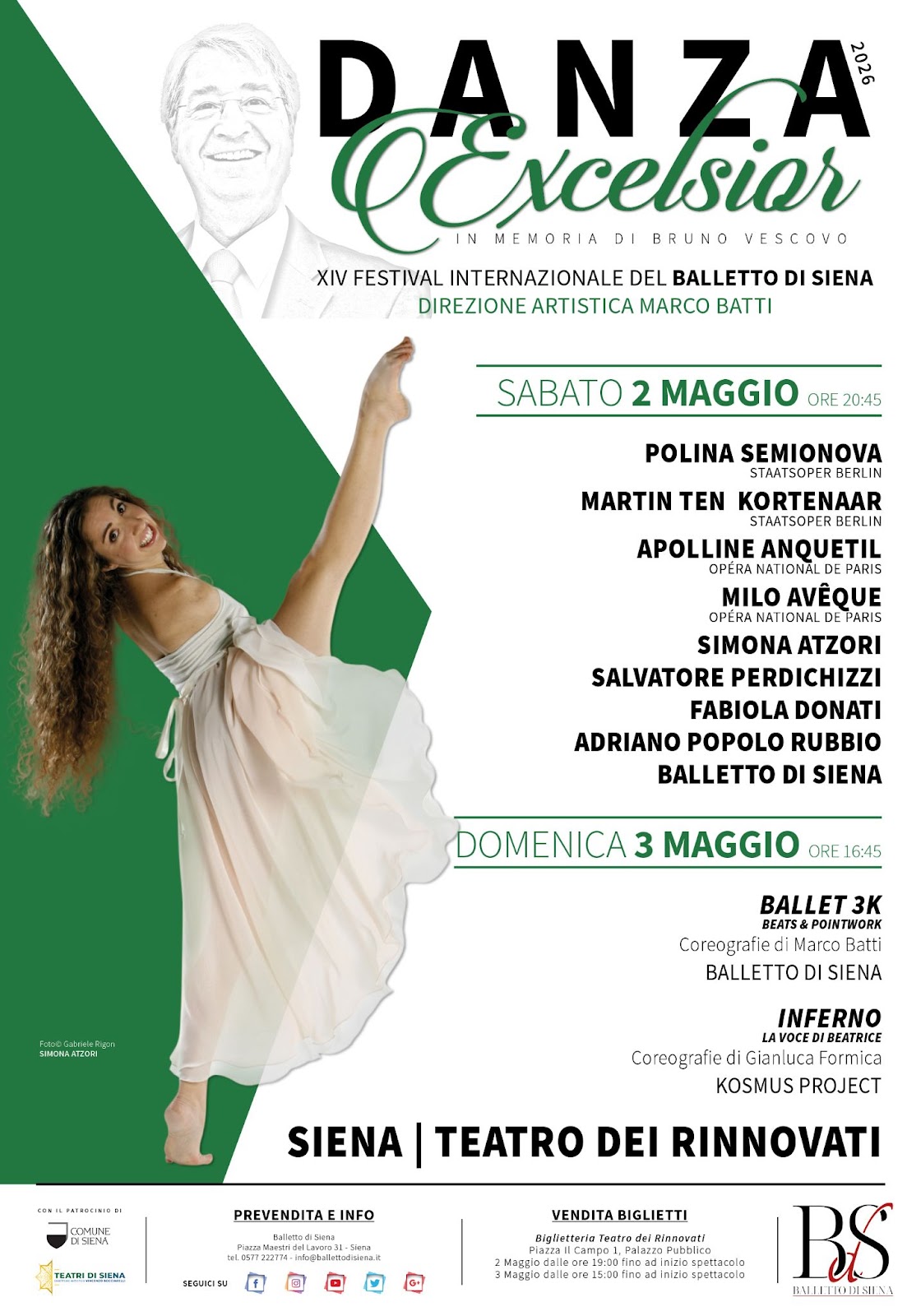 Il festival si aprirà sabato 2 maggio alle ore 21 con il tradizionale Galà Excelsior, che porterà sul palco artisti internazionali ed étoile di fama mondiale. Tra i protagonisti, Polina Semionova e Martin ten Kortenaar della Staatsoper Berlin, insieme ad Apolline Anquetil e Milo Avèque dell’Opéra National de Paris. A loro si affiancheranno ospiti d’eccezione come Simona Atzori, Adriano Popolo Rubio e i danzatori del Balletto di Siena, per una serata all’insegna dell’eccellenza e dell’emozione.
